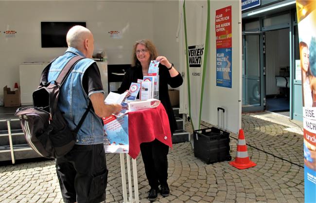 Bildunterschrift: Die Sucht- und Sozialtherapeutin Christine Kadivar von der Caritas-Suchthilfe informierte auf der Mobilitätsmeile über die Gefahren von Alkohol im Straßenverkehr. Quelle: Caritasverband für Stadt und Landkreis Hildesheim e.V.