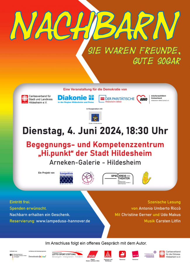 Wie passen Populismus, unterschiedliche politische Ansichten und Freundschaften zusammen? Dieser Frage geht die szenische Lesung „Nachbarn“ am 04. Juni von 18:30 Uhr bis 20:30 Uhr im Begegnungs- und Kompetenzzentrum Hi.punkt in der Arneken Galerie nach.