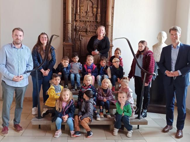 Die Führung durch das ehrwürdige Haus hatte die Leiterin des Büros des Oberbürgermeisters Jasmin Weprik übernommen. Sie erklärte den Kindern unter anderem, warum es wichtig ist, einen Bürgermeister zu haben und welche Aufgaben in einem Rathaus zu erledigen sind. Zum Abschluss schaute die Gruppe auch im Büro des Hausherren vorbei. Hildesheims Oberbürgermeister Dr. Ingo Meyer begrüßte die jungen Gäste persönlich und stellte sich für ein gemeinsames Foto zur Verfügung.