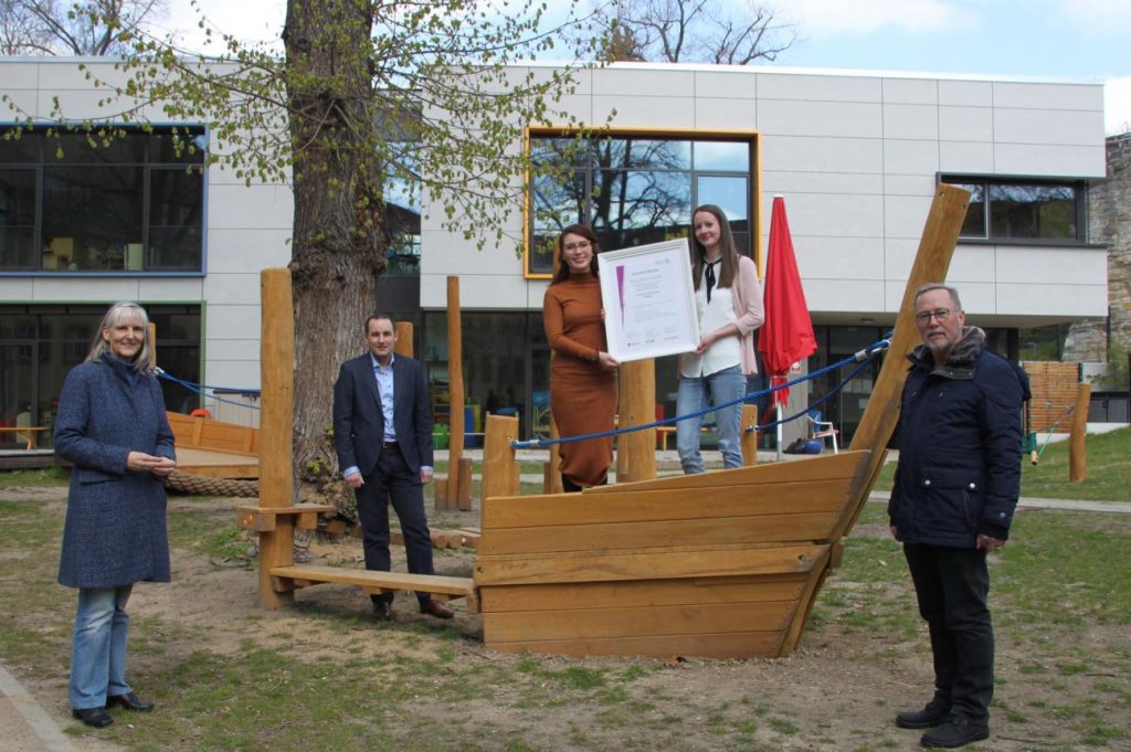 Urkunde und Preise haben Angelika Maasberg (Kompetenzzentrum für Gesundheitsförderung in Kitas) und Daniel Oppermann (Regionalgeschäftsführer der BARMER Hildesheim) an Ebru Akpinar und Lisa Kundt (Caritas-Familienzentrum St. Bernward) im Beisein von Dr. John G. Coughlan (Vorstand Caritasverband für Stadt und Landkreis Hildesheim) übergeben. Foto: Pohlmann/Caritas