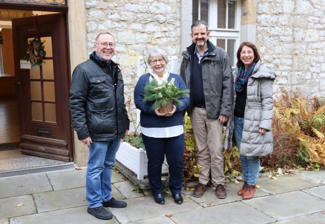 Bildunterschrift: Blumen zum Abschied: Die Caritas-Vorstände Dr. John G. Coughlan (li.) und Jörg Piprek sowie die HomeCare-Leiterin Rosemarie Kurz-Krott verabschieden Irene Wiege vor der Tagespflege in der Mühlenstraße. Quelle: Caritasverband für Stadt und Landkreis Hildesheim e.V.