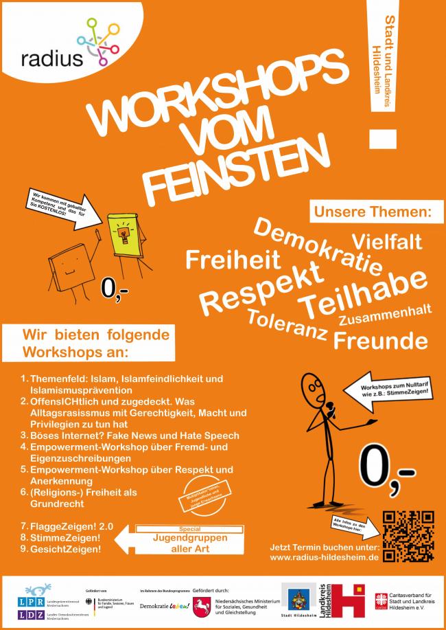 Bildunterschrift: Mit Plakaten wie diesem macht die Service- und Beratungsstelle gegen Radikalisierung und Demokratiefeindlichkeit radius auf ihre Workshops aufmerksam. Quelle: Caritasverband für Stadt und Landkreis Hildesheim e.V.