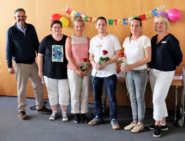 Alkoholfreier Erdbeer-Secco und eine Caritas-Rose zur Begrüßung: An ihrem ersten Arbeitstag wurden die drei neuen Auszubildenden der Caritas-St. Bernward ambulanten Pflege gGmbH Julia Milosevic, Nicole Witte und Marcel Gastreich vom Caritas-Vorstand Jörg Piprek und den beiden Geschäftsbereichsleiter*innen Christina Hamelmann und Katharina Nieden willkommen geheißen.