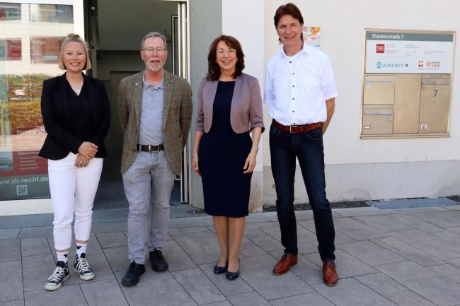 Bildunterschrift: Die scheidende Leiterin des Palliativ-Netzwerks HomeCare Rosemarie Kurz-Krott (2.v.re.) zusammen mit ihrer Nachfolgerin Maike Engelke, Caritas-Vorstand Dr. John G. Coughlan (2.v.li.) und dem ärztlichen Leiter der spezialisierten ambulanten Palliativ-Versorgung (SAPV) Dr. Stefan Krok vor den Räumlichkeiten von HomeCare.