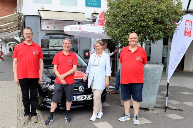 Bildunterschrift: Die Koordinatorin des Stromspar-Check-Teams Kader Cakmak und die drei Stromspar-Check-Helfer Matthias Behrens, Sascha Meyer und Thorsten Strandborg (v.li.n.re.) vor dem Stromspar-Check-Auto , mit dem sie ab Anfang Juli zu den Haushalten fahren. Foto: Caritasverband für Stadt und Landkreis Hildesheim e.V.