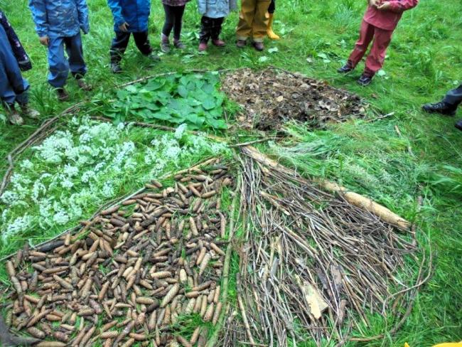 Bildunterschrift: Aus Stöckchen, Girschblüten, Blättern und weiteren Naturmaterialien aus dem Wald gestalteten die Kinder unserer Kita St. Martin ein Waldmandala.