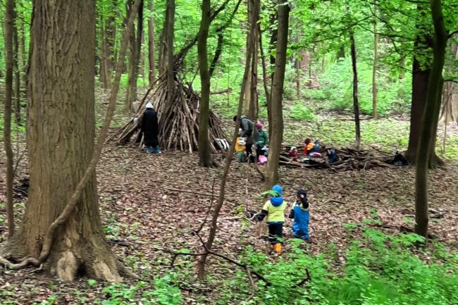 Am ersten Tag wurde mit vereinten Kräften ein „Waldsofa“ errichtet, auf dem alle gemeinsam das tägliche Frühstück einnahmen. An den darauffolgenden Tagen konnten die Kinder den Wald erkunden und auf Entdeckungstouren gehen. Sie suchten nach Kleintieren und bestaunten sie in einer Lupendosen, bauten an einer vorgefundenen Waldhütte weiter, kletterten über umgestürzte Bäume und spielten mit Stöckern.
