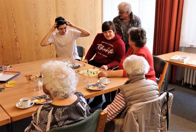 Während sich die Pflegebedürftigen über die willkommene Abwechslung freuen, verbringen Viktor und Vladislav ihre Zeit sinnvoll und erweitern gleichzeitig ihre Deutschkenntnisse. Sie helfen beim Tischdecken und Abräumen des Geschirrs, schenken Kaffee nach und spielen mit den CARENA-Teilnehmer*innen Spiele. Nur beim gemeinsamen Singen halten sie sich wegen der Sprache noch spürbar zurück.