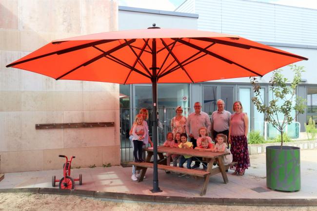 Kita-Leiterin Petra Schmidt erklärte bei der Übergabe im August: „Hier oben ist es gerade im Sommer wirklich sehr heiß und wir sind froh, dass wir den Sonnenschirm mithilfe der Spenden anschaffen konnten. Dafür ein herzliches Dankeschön!“