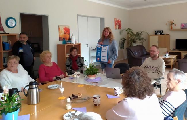 Bei ihrem wöchentlichen gemeinsamen Kaffeenachmittag im Gemeinschaftraum erhielten die Bewohner*innen des Servicewohnens in der Fahrenheitstraße am Mittwoch, 25 Oktober, ungewöhnlichen Besuch. Auf Einladung unserer Mitarbeiterin Birgit Weber stellten Sozialarbeiter*innen vom nahegelegenen Beratungs- und Begegnungszentrum BROADWAY ihre Arbeit im Fahrenheitgebiet vor.