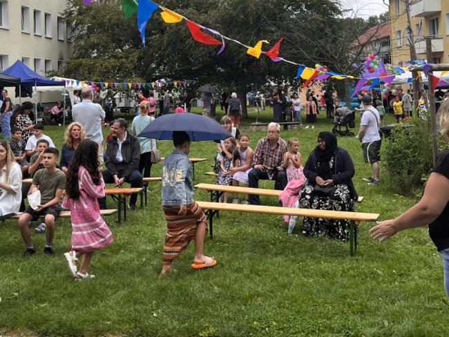 Neben zahlreichen Attraktionen und Mitmach-Aktionen für kleine und größere Kinder wie eine Hüpfburg, Kinderschminken und Geschicklichkeitsspielen erwartete die Gäste ein abwechslungsreiches und unterhaltsames Bühnenprogramm. Auch unsere Kollegen vom Stromspar-Check waren vor Ort und stellten das Projekt sowie die damit verbundenen Einsparpotenziale von Energie und Wasser vor. Für das leibliche Wohl sorgte ein Buffet mit internationales Speisen, die Anwohner*innen aus der Nachbarschaft mitgebracht hatten.